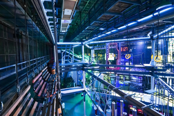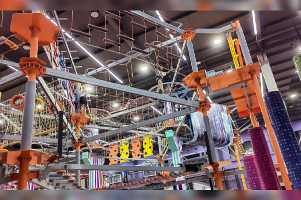 An aerial ropes course instantly becomes the visual core of an indoor park. Suspended obstacles, moving participants, and multi-level platforms create constant “action” that draws attention from every angle. This powerful visibility converts spectators into participants—guests see it, feel the excitement, and want to try.